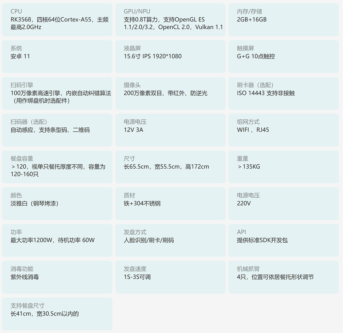 一款全自动的多功能餐托发放机,支持刷卡/刷脸等方式绑定餐托,一人可绑多个餐托,全程自动化交互,不需要进行任何操作,有 120-160 个餐托的容量可选,自带紫外消毒、臭氧消毒等功能,刷脸刷卡自动发餐盘,无需携带手机及工牌也可正常用餐。